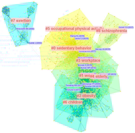 Analysis of the co-cited reference reveals that cluster #5, occupational PA, was the frontier in the SB-CVD research area. With the progress of industrialization and advances in computer science, more and more people are moving from physical to mental work, leading to an increase in SB in the workplace. The office may be a distinctive scenario where the relationship between PA/SB and CVD is the exact opposite of the other scenarios. Previous studies have shown that more SB was associated with better cardiorespiratory health [102]. Quinn et al. proposed that people who were physically active in the office were at a higher risk of CVD than those who never participate in occupational PA [103]. In other scenarios, more PA and less SB were associated with lower CVD prevalence and mortality [104,105]. The causes and mechanisms of this public health paradox remain underexplored. Furthermore, workplaces appear to be well suited for multicenter randomized trials. Several public health interventions, which aimed to reduce the risk of CVD through occupational PA intervention toolkits, have been reported [106,107].