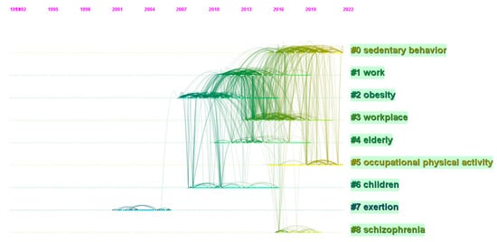 The analysis of co-citation reference can be performed by analyzing the number of publications and citations and their changes over time to generate clusters, thus exploring the hotspots and trends in the SB-CVD research area. This present study constructed and presented clusters of the SB-CVD research area using mapped knowledge domains and timeline views in CiteSpace. The Log-Likelihood Ratio algorithm was applied in this study to create the label clusters, taking into account previous research and the merits of the Log-Likelihood Ratio algorithm that this strategy could cover the “uniqueness and coverage” of all labels [36]. The modularity value (Q) and the weighted mean silhouette value (S) were applied to assess the validity of the clusters, while Q > 0.5 with S > 0.7 is the well-accepted validity threshold for a cluster. In this clustering, Q = 0.7079 with S = 0.8634 validated the effectiveness and reasonableness of the present clustering strategy. The cluster view of the knowledge map based on analysis of the co-cited reference in the SB-CVD research area from 1990 to 2022 was presented in Figure 6. The largest of the nine clusters was SB (#0), followed by cluster #1 (work) and cluster #2 (obesity). The timeline view of the development and evolution of each cluster was shown in Figure 7.