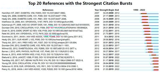 The top twenty co-cited references in the SB-CVD research area were presented in Figure 8, with the most co-cited references having the strongest citation bursts. Burst co-citation of the reference was shown in red on the blue timeline. The article: “Sitting time and mortality from all causes, cardiovascular disease, and cancer”, which was published by Katzmarzyk in 2009, received the strongest citation bursts (56.51) [57].