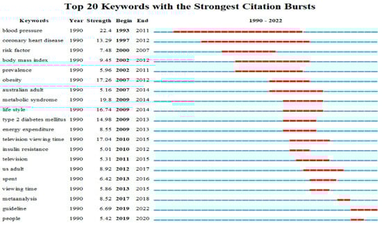 The top twenty keywords with the strongest citation bursts in the SB-CVD research area from 1990 to 2022, which were based on the keyword co-occurrence network, were shown in Figure 9. Burst co-occurrence of the keyword was shown in red on the blue timeline. Blood pressure was the keyword with the longest burst duration and the strongest citation burst, followed by obesity, television viewing time, lifestyle, type 2 diabetes mellitus, and coronary heart disease. Viewing time, meta-analysis, and people were recently occurring keywords, albeit for a short burst duration. Guideline is the current frontier in the SB-CVD research area, which has recently been within the burst stage.