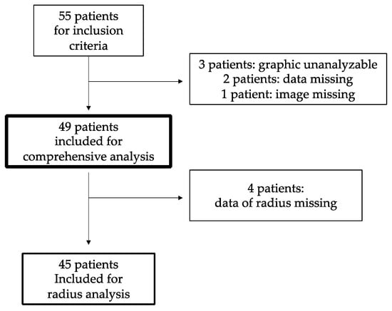 Bone mineral density was measured with GE Lunar Prodigy (GE Healthcare, Milwaukee, WI, USA) dual-energy X-ray absorptiometry. As shown in Figure 1, a total of six patients were excluded: three patients as optimal location for the analysis could not be identified; two patients as fundamental data were missing; and one patient as the patient’s chest radiograph could not be identified. In addition, of the 49 patients included in the study, four patients were found with data of the left radius missing and were excluded from the analysis of the radius.