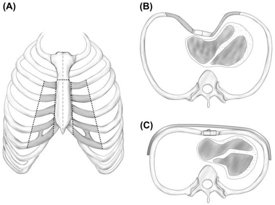 - Willekes, C.L.; Backer, C.L.; Mavroudis, C. A 26-year review of pectus deformity repairs, including simultaneous intracardiac repair. Ann. Thorac. Surg. 1999, 67, 511–518. [Google Scholar] [CrossRef]