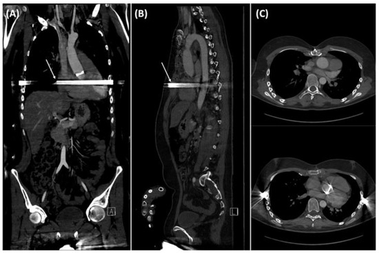 - Schwill, S.; Kallenbach, K.; Beller, C.J.; Karck, M. An alternative surgical approach for the combined treatment of pectus excavatum and acute aortic dissection type-A in Marfan syndrome. Interact. Cardiovasc. Thorac. Surg. 2011, 12, 526–528. [Google Scholar] [CrossRef]