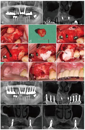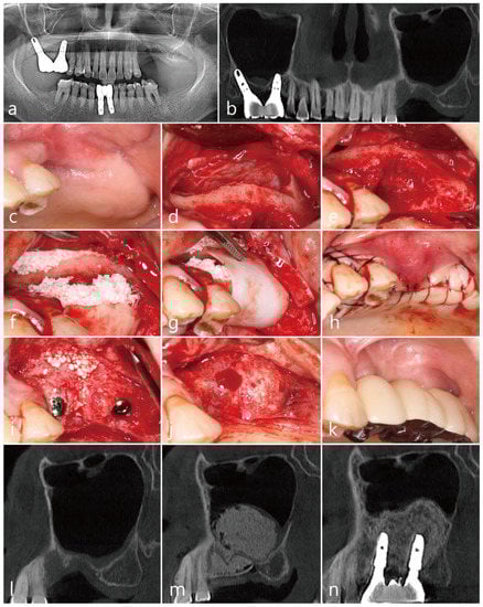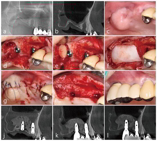 The patient was a 78 year old nonsmoking woman, who visited the clinic for implant placement in the left maxillary posterior region (Table 1). The patient was taking antihypertensive drugs and had no other diseases that could interfere with the surgery. Two months after the extractions of #25 and #26, panoramic radiographs and CBCT scans showed severe bone deficiencies in the extraction sockets (Figure 2a,b). There was no PSAA in the lateral sinus wall (Table 1). The preoperative clinical photographs revealed severe deficiencies of the hard and soft tissues of the extraction sites (Figure 2c). Under local anesthesia with 2% lidocaine (containing 1:100,000 epinephrine), the mucoperiosteal flaps were reflected, and the lateral bony window obtained during MSA was removed (Figure 2d). There was no perforation of the maxillary sinus mucosa during MSA. The extraction socket had a severe bone defect. Thorough debridement was performed to remove inflammatory granulation tissue (Figure 2e). After the MSA procedure was performed, the post-extraction defect was augmented using a particulate bone graft substitute (Osteon™ III; particle size 0.2–0.5 mm; Genoss Co., Ltd., Suwon, Republic of Korea) was performed. Then, a lateral window bone was appropriately trimmed using a grinder (Dask kit, Dentium Co., Ltd., Suwon, Republic of Korea) and was placed in the extraction defects of #25 and #26 (Figure 2f). The bone graft site was covered with a resorbable collagen membrane (Genoss Co., Ltd., Suwon, Republic of Korea) (Figure 2g), and the flaps were closed with 5-0 sutures (Figure 2h). Antibiotics (ciprofloxacin; 500 mg; Ildong Pharmaceutical Co., Ltd., Seoul, Republic of Korea) and a nonsteroidal anti-inflammatory drug (Etodol; 200 mg, Yuhan Co., Ltd., Seoul, Republic of Korea) were prescribed for two weeks. A total of 0.12% of chlorhexidine (hexamedine; Bukwang Pharmaceutical, Seoul, Republic of Korea) mouth rinsing was recommended twice a day for two weeks. Two weeks after surgery, a sinus graft infection occurred, and incision and drainage were performed at the lateral window site. An additional antibiotic (ciprofloxacin; 500 mg; Ildong Pharmaceutical Co., Ltd., Seoul, Republic of Korea) were administered for 7 days. Saline irrigation was performed once a week for six weeks. The implant was placed six months after the MSA. Due to the sinus graft infection, some resorption occurred in the grafted area of the lateral sinus window, and an additional bone graft was performed (Figure 2i). The uncovering procedure was performed six months after the implant placement. The preoperative bony defects were filled to the top of the cover screw (Figure 2j). A prosthesis was delivered two months after the uncovering procedure (Figure 2k).