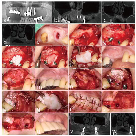 Case 3: (a) preoperative panoramic radiograph; (b) preoperative panoramic image of the CBCT scan; (c) posterior superior alveolar arteries (PSAAs) are shown on the coronal images of the preoperative CBCT scans on both sides; (d) coronal image of the preoperative CBCT scan showing a severely resorbed bone defect around the extraction site of the left maxillary second molar; (e) preoperative clinical view after extraction of the right maxillary second premolar; (f) after flap reflection, a lateral bony window was prepared for maxillary sinus augmentation; (g) a bony defect was observed after implant placement and sinus augmentation; (h) the buccal bony defect was filled with particulate bone graft; (i) the obtained lateral bony window was placed on the bony defect without fixation; (j) the surgical site was covered with a resorbable collagen membrane; (k) clinical view six months after surgery; (l) the lateral bony window was well incorporated with the surrounding native bone at six months after surgery; (m) clinical view after final prosthesis delivery; (n) after flap reflection, the #24 implant was explanted and a lateral bony window was prepared for maxillary sinus augmentation; (o) after sinus augmentation and implant placement, the buccal bony defects are shown; (p) after filling the buccal bony defect with particulate bone graft, the obtained lateral bony window was positioned on the bony defect; (q) the surgical site was covered with a resorbable collagen membrane; (r) the flaps were closed with minimal tension; (s) the uncovering procedure was performed six months after surgery, and the grafted lateral bony window was well integrated with the surrounding native bone; (t) the bone above the cover screw was removed with a round surgical bur, and after the healing abutments were inserted, the flaps were closed; (u) clinical view after final prosthesis delivery; (v) coronal CBCT image at six months after prosthesis delivery; (w) coronal CBCT scan showing the filling of the defect around the implant placed at the extraction site of the left maxillary second molar.