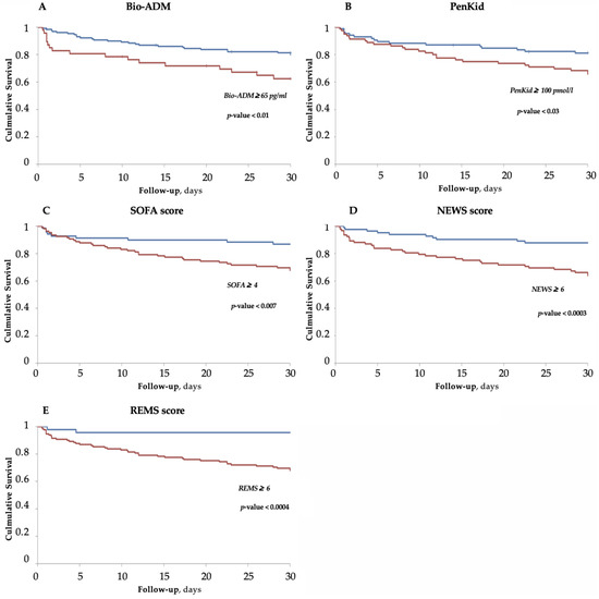 Casalboni, S.; Valli, G.; Terlizzi, F.; Mastracchi, M.; Fidelio, G.; De Marco, F.; Bernardi, C.; Chieruzzi, A.; Curcio, A.; De Cicco, F.; et al. 30 Days Mortality Prognostic Value of POCT Bio-Adrenomedullin and Proenkephalin in Patients with Sepsis in the Emergency Department. Medicina 2022, 58, 1786. https://doi.org/10.3390/medicina58121786