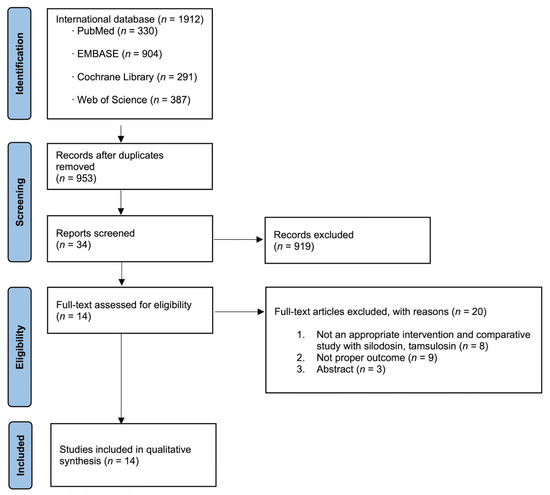 A systematic review of the four English-language databases PubMed, EMBASE, the Cochrane Central Register of Controlled Trials (Central), and Web of Science was performed to identify articles published before July 2022 that described comparisons of silodosin versus tamsulosin for MET of ureteral stones. Search strategies included medical subject headings such as “urolithiasis”, “ureterolithiasis”, “ureteral calculi”, “nephrolithiasis”, “medical expulsive therapy”, “tamsulosin”, “silodosin”, and aforementioned terms.