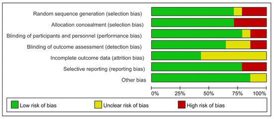 The qualities of the included studies were acceptable, as shown in Table 1. Five studies were rated as 1+ and the remaining nine studies were rated as 1−, according to the SIGN checklist. The risks of bias are shown in Figure 2 and Figure 3; all studies exhibited a reasonable risk of bias.