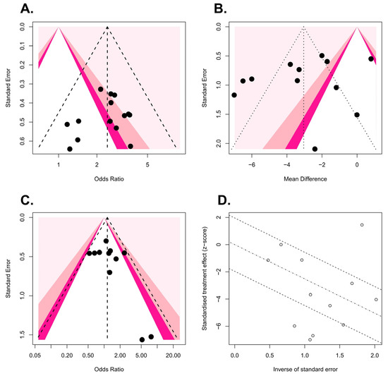 where “Q” is the Cochrane heterogeneity statistic, and “df” is the degrees of freedom. Funnel plots and Egger’s test were used to assess the potential for publication bias. Additionally, sensitivity analysis was conducted to identify potential outcome reporting bias. All meta-analyses were conducted using the meta and metasens packages in R software, version 4.1.3 (R Foundation for Statistical Computing, Vienna, Austria; http://www.r-project.org (accessed on 1 September 2022)), as well as Review Manager, version 5.4.1 (RevMan, Copenhagen, Denmark: The Nordic Cochrane Center, The Cochrane Collaboration, 2020). This systematic review was registered in PROSPERO: CRD42022349671.