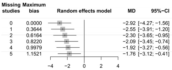Funnel plots of the meta-analyses are shown in Figure 4. Little publication bias was identified in Figure 4A,C, whereas some publication bias was identified in Figure 4B. However, Egger’s test showed no evidence of publication bias (Figure 4A, p = 0.40; Figure 4B, p = 0.22; Figure 4C, p = 0.40). Forest plots of the meta-analyses are shown in Figure 5. Little heterogeneities were observed in terms of the stone expulsion rate and total complication rate (Figure 5A, I2 = 0%; Figure 5C, I2 = 7%). Thus, fixed-effects models were used to compare the stone expulsion rate and total complication rate between silodosin and tamsulosin. High heterogeneity was observed in terms of stone expulsion time (Figure 5B, I2 = 89%). After the selection of the effect models, some heterogeneity was also observed in the radial plot of stone expulsion time (Figure 4D). Therefore, a random-effects model was used to compare stone expulsion time between silodosin and tamsulosin. Additionally, to investigate the degree of heterogeneity, a sensitivity analysis of outcome reporting bias was performed. This meta-analysis exhibited robust heterogeneity because the findings concerning stone expulsion time were not affected until at least five studies were excluded (Figure 6).
