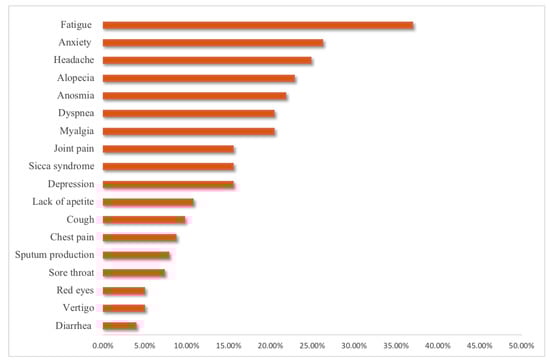 As mentioned before, the proportion of our study patients with at least one persistent COVID-19 symptom was high (73.3%) when compared with other studies. For example, Desgranges et al. and Logue et al. observed at least one persistent COVID-19 symptom in 53% and 32.7% of their respective studied outpatients [11,12]. Otherwise, when comparing our findings in outpatients with studies performed in hospitalized patients, the proportion of those with persistent symptoms is similar. In their systematic review and meta-analysis of hospitalized COVID-19 patients, López León et al. reported that 80% had at least one or more persistent symptom (the time for the different studies ranged from 14 to 110 days) [30]. Finding the cause for the different percentages observed among the studies is beyond the scope of the present investigation; however, the observed difference could be associated with several factors including ethnicity, gender, body mass index (BMI), and age [15,31].