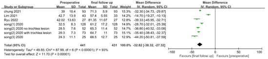 | song 2020 (2) [18] | older than 40 years, ICRS IV (>4 cm2) in medial compartment, KL grade 1–3, and femorotibial angle varus > 5° | 125 | with trochlea lesion: 73 | 58.3 ± 6.8 (43–74) | 25.6 ± 2.7 kg/m2 (19.2–35.5) | 6.9 ± 2 cm2 | 3 Y | VAS, WOMAC, IKDC, and ICRS | with HTO | retrospective cohort | subgroup analysis: age, obesity, lesion size, location, and number of lesions |