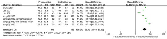 | song 2020 (1) [19] | older than 40 years, ICRS IV (>2 cm2), KL grade 1–3, and femorotibial angle (varus or valgus) < 8° | 128 | N/A | 56.5 ± 7.9 (40–78) | 24.6 ± 3.6 kg/m2 (17–45.8) | one/two/three, 67 (4.5 ± 1.3)/49 (7.3 ± 2.9)/12 (9.8 ± 3.6) | 36.1 ± 6.4 M (25–47 M) | VAS, WOMAC, IKDC, and MOCART (for 34 pts) | without HTO | retrospective cohort | subgroup analysis: trochlea lesion, age, and lesion size |