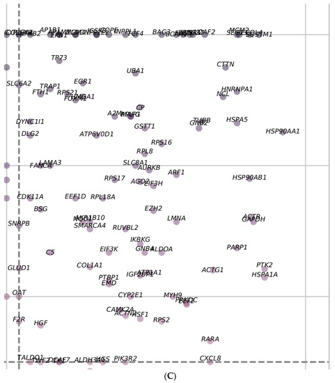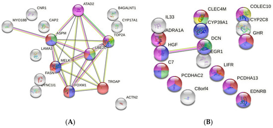Interactions of 3 group of DEGs were shown in the STRING online database (http://string-db.org (accessed on 5/6 December 2021)) [26]. Network nodes represented proteins and edges represented protein–protein associations.