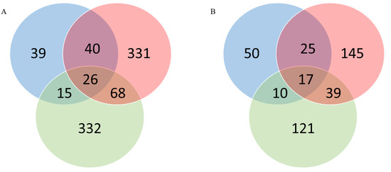 Venn diagrams for (A) the upregulated genes in the analyzed etiologies and (B) the downregulated genes in the analyzed etiologies. Blue circles: HBV patients; red circles: HCV patients; green circles: non-B, non-C patients).