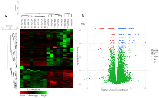 The patients were divided into 3 groups: 8 with HBV, 8 with HCV, and 8 without viral infection. The patients’ demographic and clinical features are listed in Supplementary Table S1, and representative histology (hematoxylin–eosin staining) images are presented in Supplementary Figure S1. The mean age was 57 years for the HBV group, 64 years for the HCV group, and 62 years for the non-viral group, thus indicating no significant differences between the average ages for these HCC groups (p = 0.4251). The differences between serum AFP levels were statistically significant for all 3 HCC groups (p = 0.0451), and PIVKA (Protein Induced by Vitamin K Absence-II) markers showed increased levels in the non-viral group compared with the HBV group.