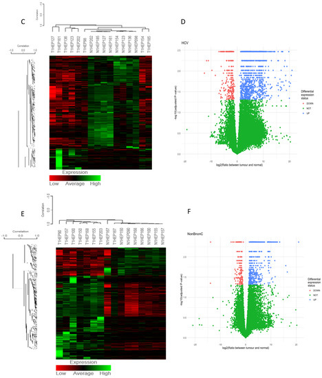 Heatmaps of DEGs in non-tumoral and tumoral tissues and volcano plots showing statistically significant up- (blue) and downregulated genes (red) for: (A,B) HBV-related tumors, (C,D) HCV-related tumors, and (E,F) non-viral-infected tumors. In all volcano plots, genes that did not pass the statistical threshold are shown in green.