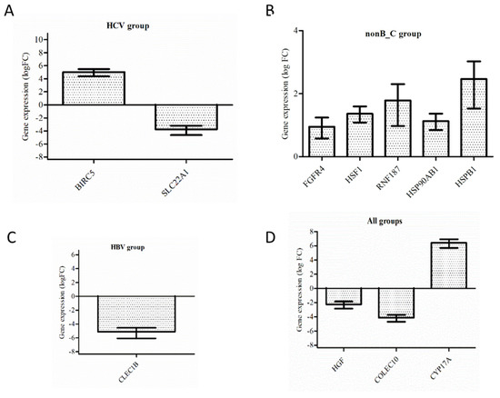 Expression levels for (A) BIRC5 (logFC = 5.02) and SLC22A1 (logFC = −3.74) in the group of patients with HCV infection; (B) FGFR4, HSF1, RNF187, HSP90AB1, and HSPB1 specific to the group of patients without viral infection; (C) CLEC1B (logFC = −5.12) specific to the group of patients with HBV infection; and (D) the common genes HGF (log FC = −2.26), COLEC10 (logFC = −4.13), and CYP17A (logFC = 6.42) among all 3 groups. Gene expression values were normalized to b-actin and paired non-tumoral tissues. The relative levels of expression were calculated by the 2−ΔΔCT method (bars indicate standard errors of the means (±SEMs)).