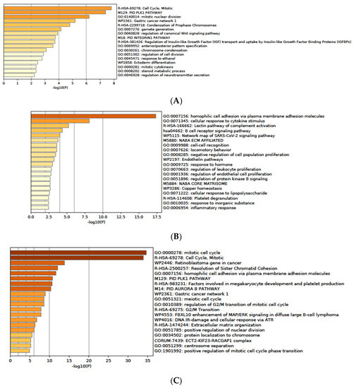 Functional enrichment gene ontology (STRING) local network clusters, color-coded. (A) 3 tumor groups with common upregulated DEGs. Blue: mitotic cytokinesis and gastric cancer network 1; red: mitotic spindle checkpoint and mitotic nuclear division; green: G2/M DNA replication checkpoint and gastric cancer network 1; yellow: G2/M DNA replication checkpoint and DNA topoisomerases; purple: Wiki Pathways—gastric cancer network 2. (B) 3 tumor groups with common downregulated DEGs. Red: integral component of plasma membrane; blue: signal; green: complement system; yellow: mannose binding; purple: glycoproteins.