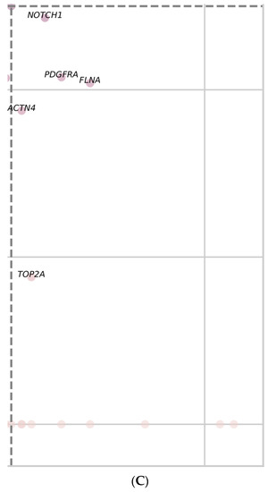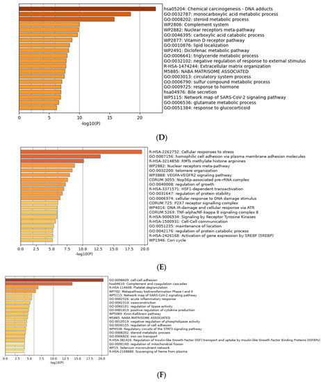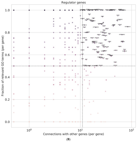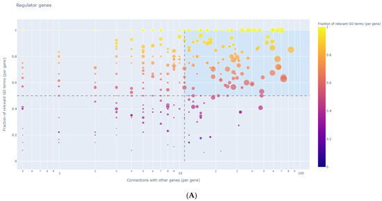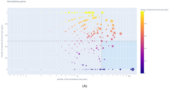 Functional enrichment analysis was performed using METASCAPE [24]. For each gene list, pathway and process enrichment analyses were carried out using: the KEGG Pathway, GO Biological Processes, Reactome Gene Sets, Canonical Pathways, Cell Type Signatures, CORUM, TRRUST, DisGeNET, PaGenBase, Transcription Factor Targets, WikiPathways, PANTHER Pathway, and COVID. All genes in the genome were used as the enrichment background. Terms with a p-value < 0.01, a minimum count of 3, and an enrichment factor >1.5 (the ratio between the observed counts and the counts expected by chance) were collected and grouped into clusters based on their membership similarities. More specifically, p-values were calculated based on cumulative hypergeometric distributions, and q-values were calculated using the Benjamini–Hochberg procedure to account for multiple testing. Kappa scores were used as the similarity metrics when performing hierarchical clustering of the enriched terms, and sub-trees with a similarity of >0.3 were considered as clusters. The most statistically significant term within a cluster was chosen to represent the cluster [24]. Relevant gene functional analysis was performed using GeneWalk, PMID: 33526072 [25]. Genes of interest (hub genes or moonlighting genes) were selected using the following thresholds: global_padj < 0.1; ncon_gene ≥ 50; and ncon_go ≥ 50 [25].