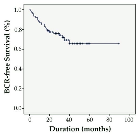 During a median 36 months of follow-up, the BCR-free rate and overall survival rate were 71.1% and 100.0%, respectively. None of the patients died of cancer-specific causes. Twenty-two patients had BCR, of whom thirteen received salvage androgen deprivation therapy (ADT), two received salvage external beam radiation therapy (EBRT) alone, and seven received combined ADT and EBRT. No patient had disease progression to castration-resistant prostate cancer during a median 31 months of follow-up after salvage therapy (Figure 1).