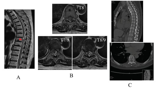 A 70-year-old woman had been increasingly facing walking difficulties for approximately 3 months. When her walking impairment started, she experienced several physical problems, including flank pain, balance impairment, sensory deficits, and muscle weakness (manual muscle testing grading system 3) under the umbilical region. She was diagnosed with intradural extramedullary spinal cord meningioma, which was observed in the thoracic spine region (T8) using T2-weighted magnetic resonance imaging and computed tomography images (Figure 1A–C). Surgical management of the tumor was planned. The day before the surgery, a physiotherapist evaluated the patient’s neurological impairment and disability. The patient could perform only mild voluntary movements in both lower limbs; showed sensory disorders, including hypesthesia of the hip, anus, and lower limbs; and required assistance for activities such as standing and walking, indicating severe impairment of activities of daily living.
