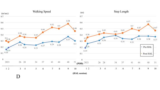 We evaluated the occurrence of adverse events related to HAL training. For that, we evaluated some variables, including walking speed, step length, and cadence, using the 10 m walking test before the first HAL training session (before 1 session, baseline) and after completion of the entire set of sessions (10 sessions). The NLI, ASIA impairment scale classification, ISNCSCI motor and sensory scores, WISCI-II, BBS, FIM, and modified Ashworth scale scores for the lower extremity were also assessed [,,,,,,]. Walking speed and step length were measured with the 10 m walking test before (pre-HAL) and after (post-HAL) HAL training in each session to evaluate the immediate effect of HAL training. The patient was instructed to walk on a flat surface at a comfortable pace during the 10 m walking test, and walking time was measured using a handheld stopwatch, which was used to calculate the walking speed. The number of steps taken between the start and finish line was counted to calculate the step length (meters), and the cadence was calculated based on the number of steps taken over the walking time, measured as the number of steps per minute.