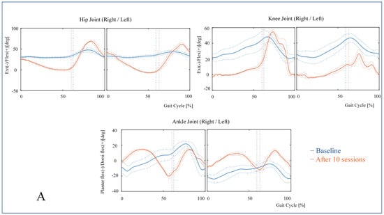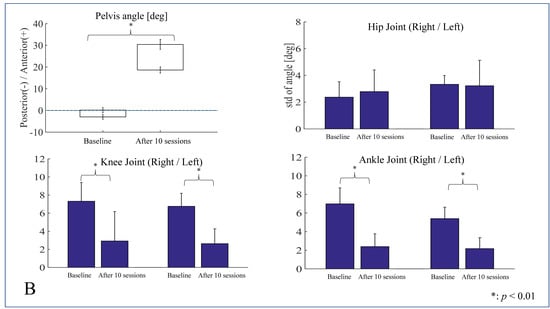 The sessions greatly improved the walking speed and step length. The maximum extension angles of the hip joint during the stance phase increased from −28.9° at the baseline to 7.5° after 10 sessions and −28.3° at baseline to 0.5° after 10 sessions, on the left and right sides, respectively. The maximum extension angles of the knee joints after 10 sessions also increased from −18.6° to 4.91° and from −15.9° to 3.4° on the left and right side, respectively. The maximum dorsiflexion angles of the ankle joint during the swing phase increased from −2.83° at baseline to 13.5° after 10 sessions on the left and decreased from 23.0° at baseline during the swing phase to 15.4° after 10 sessions during the stance phase on the right (Figure 2A). The average standard deviations of the knee (baseline, right, 7.31; left, 6.75; after 10 sessions, right, 2.93; p < 0.01, left, 2.63; p < 0.01) and ankle joints (baseline, right, 6.98; left, 5.40; after 10 sessions, right, 2.39; p < 0.01, left, 2.18; p < 0.01) were significantly decreased. The average of the standard deviations of the pelvic angles was significantly increased (baseline, −1.45; after 10 sessions, 24.29; p < 0.01). However, no significant difference in the average standard deviations of the hip joints was observed (baseline, right, 2.38; left, 3.34; after 10 sessions, right, 2.79; p < 0.03589, left, 3.23; p < 0.5926) (Figure 2B). Lower limb muscle activation during the gait cycle was rarely observed before HAL gait training. However, after HAL gait training, lower limb muscle activation during the gait cycle increased (Figure 2C).