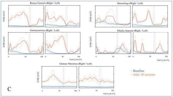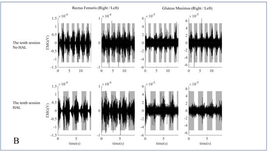 Electromyography (EMG) was recorded during the 10 m walking test without the participant wearing the HAL suit at the baseline and after 10 sessions. Additionally, we recorded and compared EMG activity profiles of lower limb muscles during the first and tenth HAL training sessions with and without HAL. As previously described [,,], EMG sensors were placed bilaterally on the muscle relevant to the hip, knee, and ankle joints. Muscle activity was recorded for the rectus femoris, gluteus maximus, hamstrings, tibialis anterior, and gastrocnemius muscles using the TrignoTM Lab Wireless EMG System (Delsys, Inc., Boston, MA, USA) sampling at 2 kHz synchronized with the motion capture system.