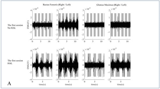 (A) Band-pass filtered EMG data of the rectus femoris and gluteus maximus muscles compared during the HAL training (with and without HAL) in the first session. (B) Band-pass filtered EMG data of the rectus femoris and gluteus maximus muscles compared during the HAL training (with and without HAL) in the tenth session.