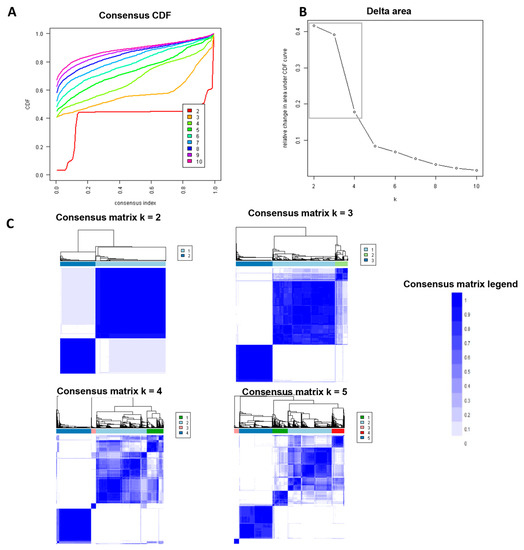 The following are available online at https://www.mdpi.com/article/10.3390/medicina58121831/s1. Figure S1. Consensus matrix heat map (k = 2) depicting consensus values on a white to blue color scale of each cluster; Figure S2. Consensus matrix heat map (k = 3) depicting consensus values on a white to blue color scale of each cluster; Figure S3. Consensus matrix heat map (k = 4) depicting consensus values on a white to blue color scale of each cluster; Figure S4. Consensus matrix heat map (k = 5) depicting con-sensus values on a white to blue color scale of each cluster; Figure S5. Consensus matrix heat map (k = 6) depicting consensus values on a white to blue color scale of each cluster; Figure S6. Consensus matrix heat map (k = 7) depicting consensus values on a white to blue color scale of each cluster; Figure S7. Consensus matrix heat map (k = 8) depicting consensus values on a white to blue color scale of each cluster; Figure S8. Consensus matrix heat map (k = 9) depicting con-sensus values on a white to blue color scale of each cluster; Figure S9. Consensus matrix heat map (k = 10) depicting consensus values on a white to blue color scale of each cluster. References [52,53,54,55,56,57,58,59,60,61,62,63,64,65,66,67] are cited in the supplementary materials.