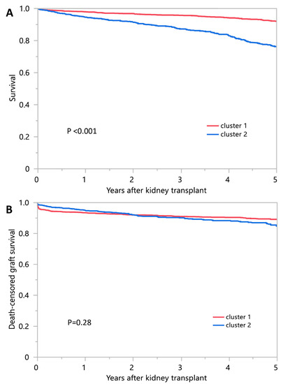 (A) Patient survival; (B) Death-censored graft survival outcomes among two identified clusters of DKT patients.