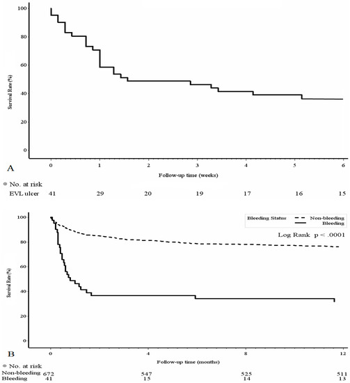 We also acknowledge that there are several limitations to our study. First, this was a retrospective study conducted at one medical center. However, more than 700 patients were included, which is the second largest case number analyzing the risk for PBUB. In addition, more clinical variables were included that are more practical in the real world. Second, we did not analyze the influence of post-EVL medication, such as the usage of proton pump inhibitors and nonselective beta-blockers (NSBBs). Most of our patients were not given proton pump inhibitors as this medication is not recommended after EVL in the guidelines [1,24]. NSBBs are the medical treatment for the primary and secondary prevention of esophageal varices bleeding and are usually prescribed to stable cirrhotic patients. In our cohort, more than 85% of EVL was performed in acute bleeding conditions and the role of NSBBs was limited. Therefore, we did not analyze the effect of NSBBs. One study in Germany suggested that NSBBs do not lower the risk of PBUB after prophylactic EVL [8]. Third, some risk factors associated with PBUB were not analyzed in this study such as detachment of ligation bands and reflux esophagitis [9,10]. Both factors were difficult to access in acute bleeding conditions. In our cohort, more than 85% of EVL was performed emergently and post-EVL endoscopic evaluation was only performed in bleeding conditions. In our follow-up endoscopy, no residual bands were detected.