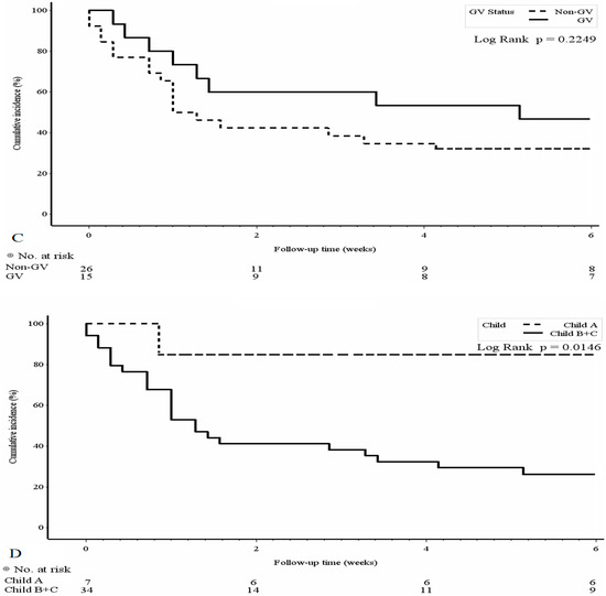 To evaluate the clinical outcome of PBUB, we performed univariate analysis for 6-week mortality risk factors and the results are shown in Table 3. Child-Pugh scores B and C (OR: 16.67, 95% CI: 1.75–158.1, p = 0.014) and ALBI grade 3 (OR: 4.8, 95% CI: 1.18–19.6, p = 0.029) were associated with 6-week mortality. The Kaplan-Meier plot with log-rank analysis is shown in Figure 2 by MELD score, ALBI score, the presence of gastric varices and Child-Pugh score. Patients with ALBI grades 1 and 2 and Child-Pugh A showed significantly better outcomes within 6 weeks after PBUB.