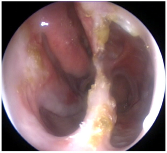 An otolaryngologist plays an important role in its diagnosis and treatment [10]. The most common ENT manifestations include epistaxis, sinus inflammation, nasal obstruction, facial nerve palsy [11], and hearing loss [12]. Clinically, the literature reports septal perforation as the most common feature of damage and a prevalence of subglottic stenosis between 6 and 23% [13,14]. Other signs, such as mucosal ulcerations of the nose with bone and cartilage destruction, might be present with evolution of the disease.