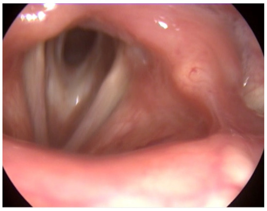The laryngeal endoscopy revealed subglottic stenosis and free vocal cords, which were mobile with breathing and phonation. The stenosis had not progressed since the last follow-up (Figure 2).