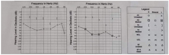 The audiogram showed mixed hearing loss after repeated otitis for which she had tympanotomy (Figure 3).