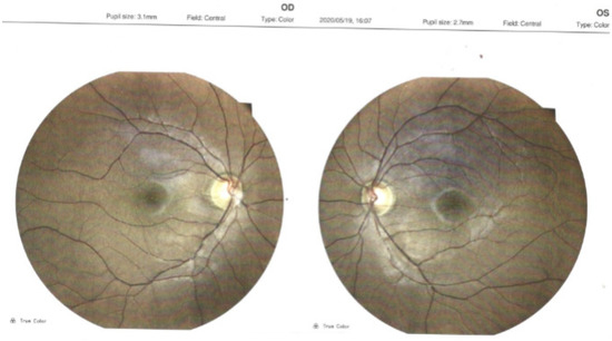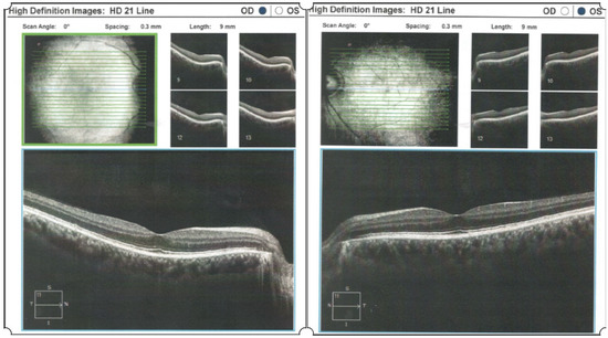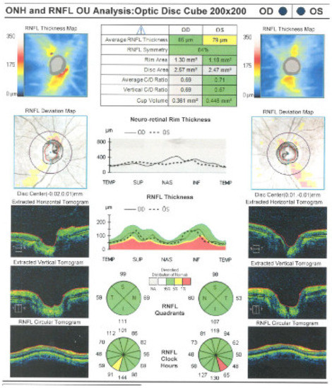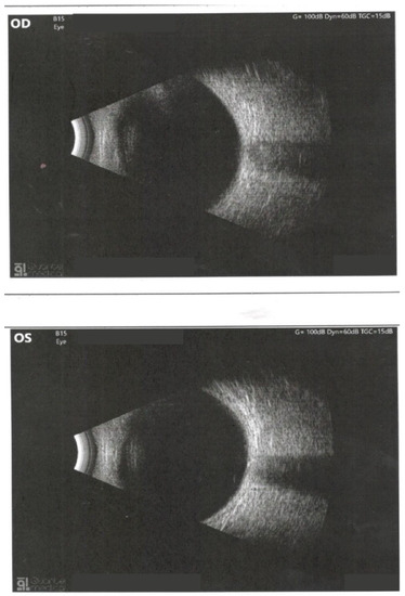 The slit lamp examination revealed a normal aspect of the anterior pole. In order to correctly evaluate the posterior pole structures, a complex examination was performed that included: retino photography, ocular ultrasound, and optical coherence tomography (OCT) (Figure 4, Figure 5, Figure 6 and Figure 7). The pathological findings highlighted by the ancillary tests were: discreet miliary drusen, a slight reduction of the thickness of the retinal nerve fiber layer in the LE, and a C/D ratio of 0.69/0.7. These pathological features are not specific to granulomatosis with polyangiitis.