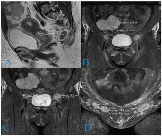 Magnetic resonance imaging: (A) cervical formation; (B) ovarian formation; (C) pathologically enlarged pelvic lymph nodes; (D) bilaterally pathologically enlarged inguinal lymph nodes forming a cluster on the left side.