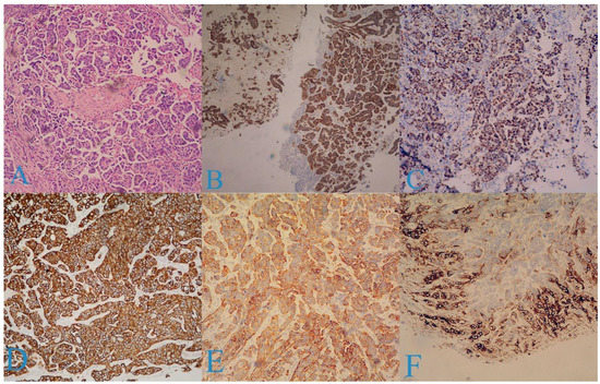 The immunohistochemical study of other markers revealed WT1-negativity in the tumor cells, with positive internal control in the stroma; p63 was positive in 80–90% of the tumor cells (Figure 4B); and p53 was uninterpretable.