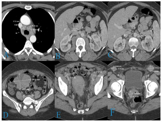 CT findings: (A) low paratracheal group (19/14 mm); (B) right paraaortic lymph nodes (11/9 mm); (C) left paraaortic lymph nodes (20/10 mm); (D) right ovarian tumor formation (87/69 mm); (E) common iliac lymph nodes (23/17 mm on the right and 28/18 mm on the left); (F) soft tissue lesion in the cervix (35/25) mm and inguinal lymph nodes (22/18 mm on the right and 27/23 mm on the left).