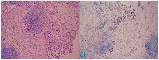 Histological findings of a metastatic inguinal lymph node: (A) carcinoma tissue with micropapillary growth pattern; (B) p63—positive in 80–90% of tumor the cells.
