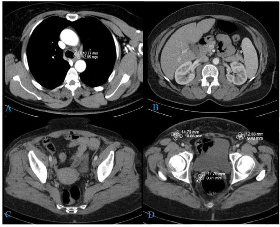 Restaged CT findings: (A) 30% decrease in the pathologically enlarged paratracheal lymph nodes; (B) the para aortic lymph nodes are not visible (all with normal size); (C) the common iliac lymph nodes are also not visible; (D) soft tissue lesion in the cervix and the inguinal lymph nodes again present size reduction of over 30%.