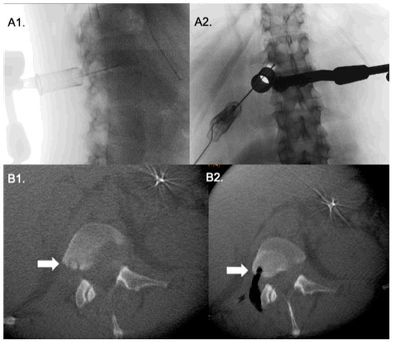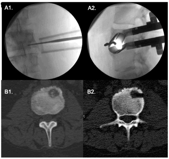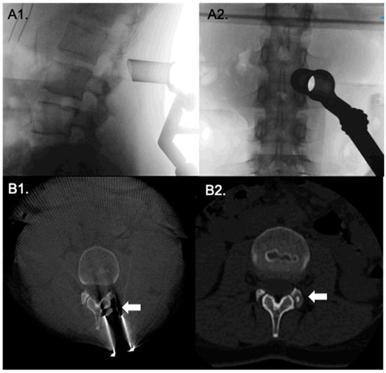 Transforaminal approach to to a tumor in the posterior aspect of L1 vertebral body. Lateral and antero-posterior fluoroscopy (A1,A2) show the tubular retractor with a probe pointing to the lesion site. Intraoperative O-arm CT axial cuts (B1,B2) before and after tumor resection.