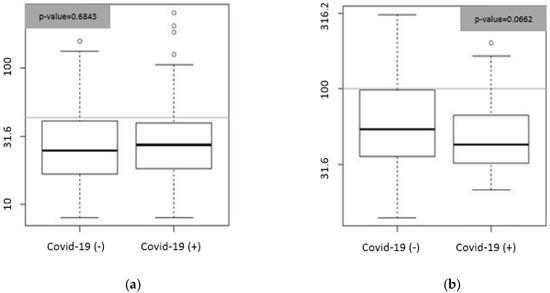 (a) Box plot. Concentrations expressed in pg/mL of Bio-ADM in the COVID– (n = 52) and COVID+ group (n = 101)) at T0. Gray lines represent the 99th percentile of normal values (43 pg/mL); black lines represent median values (COVID− = 24.8; COVID+ = 27.3). (b) Box plot. Concentrations expressed in pmol/L of penKid in the COVID− (n = 52) and COVID+ group (n = 101). Gray lines represent the 99th percentile of normal values (100 pmol/L); black lines represent median values (COVID− = 54.14; COVID+ = 43).