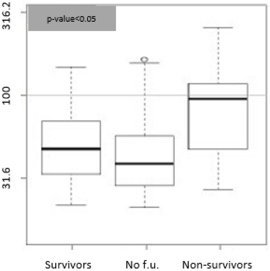 PenKid values did not correlate with mortality at T1 and T10 but were predictive of mortality at T30; p-value = 0.02. The mean ± SD in the group of patients who died at 30 days was 99 ± 66 pmol/L compared to 55 ± 33 pmol/L of survivors, as shown in Figure 3.