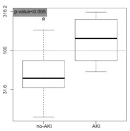 PenKid concentrations expressed in pmol/L. Box plots. No-AKI: distribution of the penKid values of the patients who did not develop AKI (n = 149, median = 44.3); AKI: distribution of the penKid values of the patients who developed AKI (n = 4, median = 151.1).