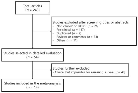 APA StyleJeong, S. Y., Lee, K.-j., Cha, J., Park, S. Y., Kim, H. S., Kim, J. H., Lee, J.-J., Kim, N., & Park, S. T. (2022). Meta-Analysis of Survival Effects of Receptor Tyrosine Kinase-like Orphan Receptor 1 (ROR1). Medicina, 58(12), 1867. https://doi.org/10.3390/medicina58121867