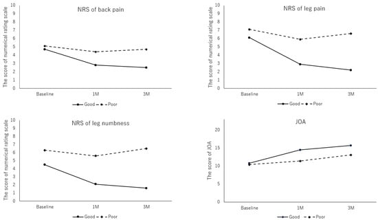 Changes in the numerical rating scale (NRS) of back pain, leg pain, and leg numbness, and the Japanese Orthopaedic Association (JOA) scores after chemonucleolysis with condoliase.