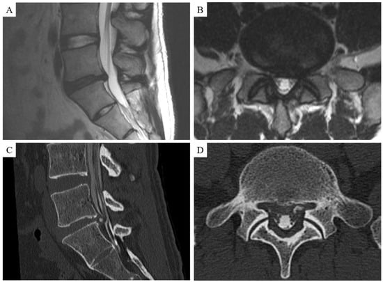 Illustrative example of a patient in the poor group with a calcified disc herniation. T2-weighted sagittal (A) and axial (B) magnetic resonance images show an L5/S1 disc herniation. Sagittal (C) and axial (D) computed tomography myelography helped to confirm the calcified disc herniation.